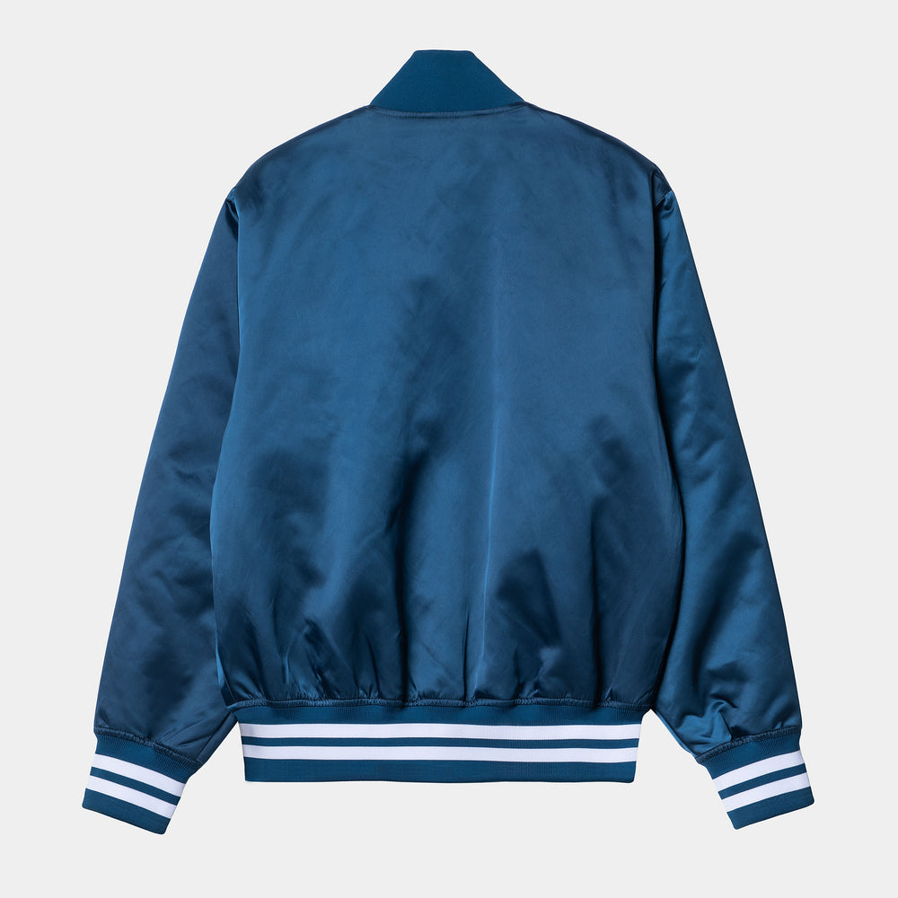 Die Class of 89 Bomber Jacket besteht aus leichtem Nylontwill. Der Kragen, die Bündchen und der Saum sind rippgestrickt und erzeugen einen zusammengezogenen Effekt. Die Jacke hat zwei Leistentaschen mit Knopfverschluss und auf der Brust befindet sich eine Grafikstickerei.
